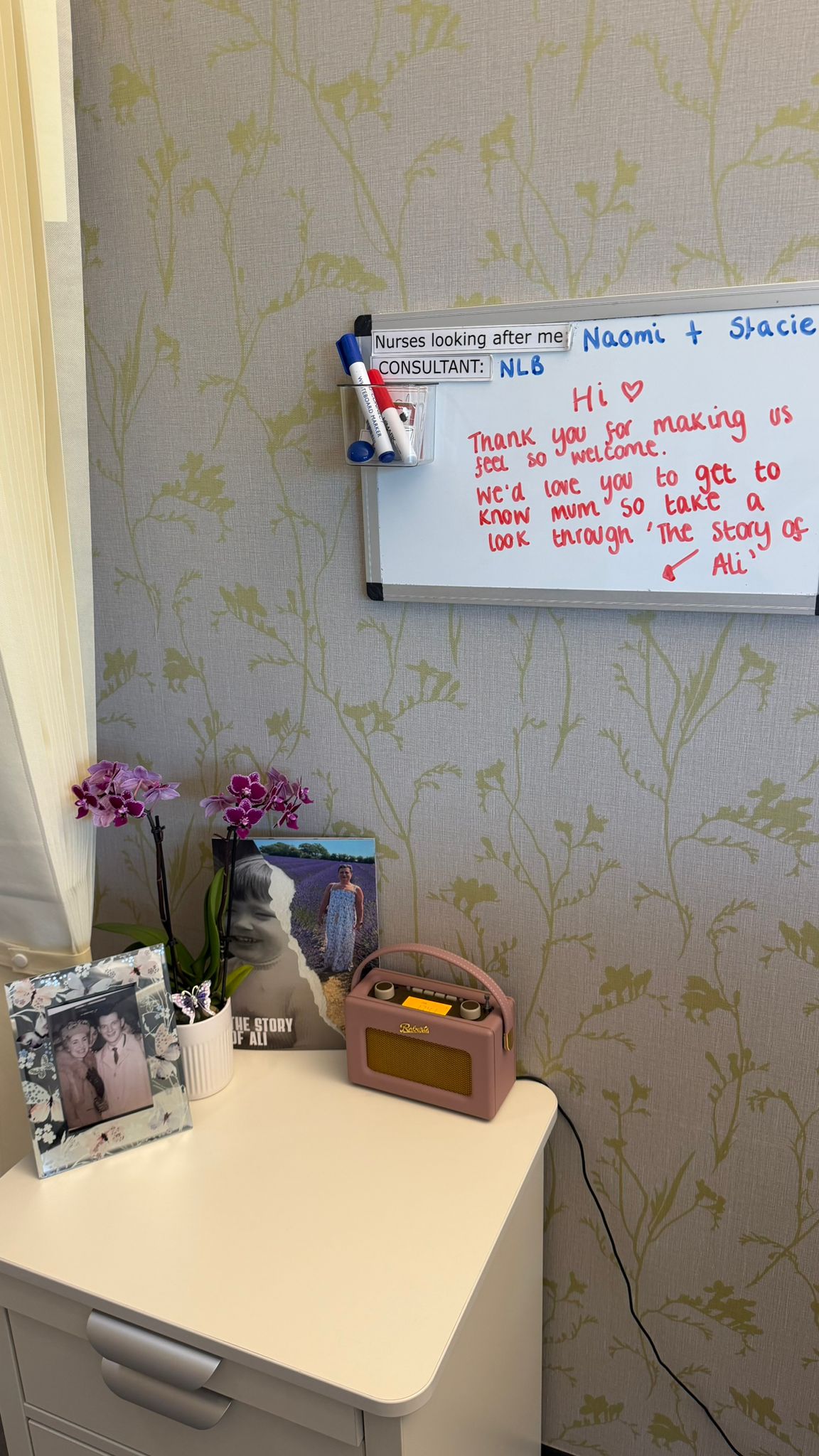 Mum is sleeping consistently now. We have tried to create a peaceful, restful space around her, ambient music playing throughout the day, warm lighting, and homely scents filling the room. We’ve decorated the walls and brought in The Story of Ali, a book we made that shows Mum’s life in pictures right from her birth in 1970. The nurses have loved getting to know her through it.